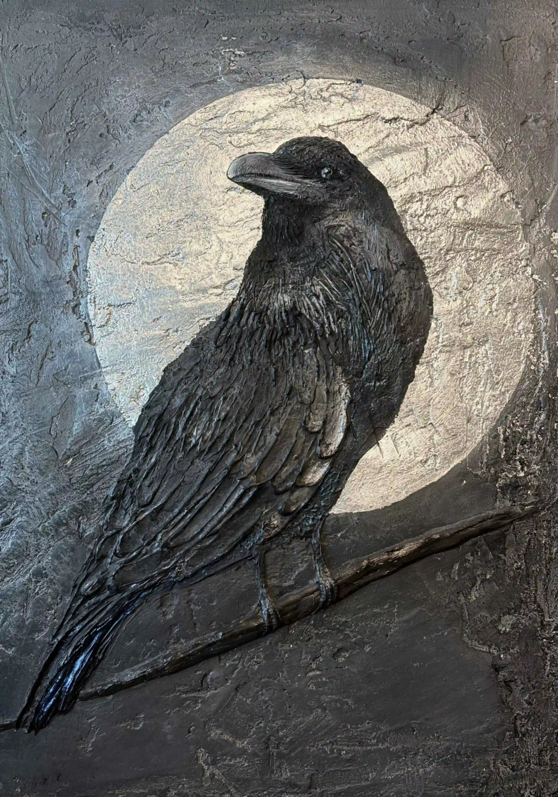 Dzięki swojej ekspresyjnej powierzchni obraz kruk ze srebrną fakturą dobrze odnajduje się w nowoczesnych wnętrzach. Może stanowić centralny element przestrzeni salonu, gabinetu lub pracowni, gdzie jego struktura oraz srebrne refleksy będą zmieniać się wraz z naturalnym oświetleniem.