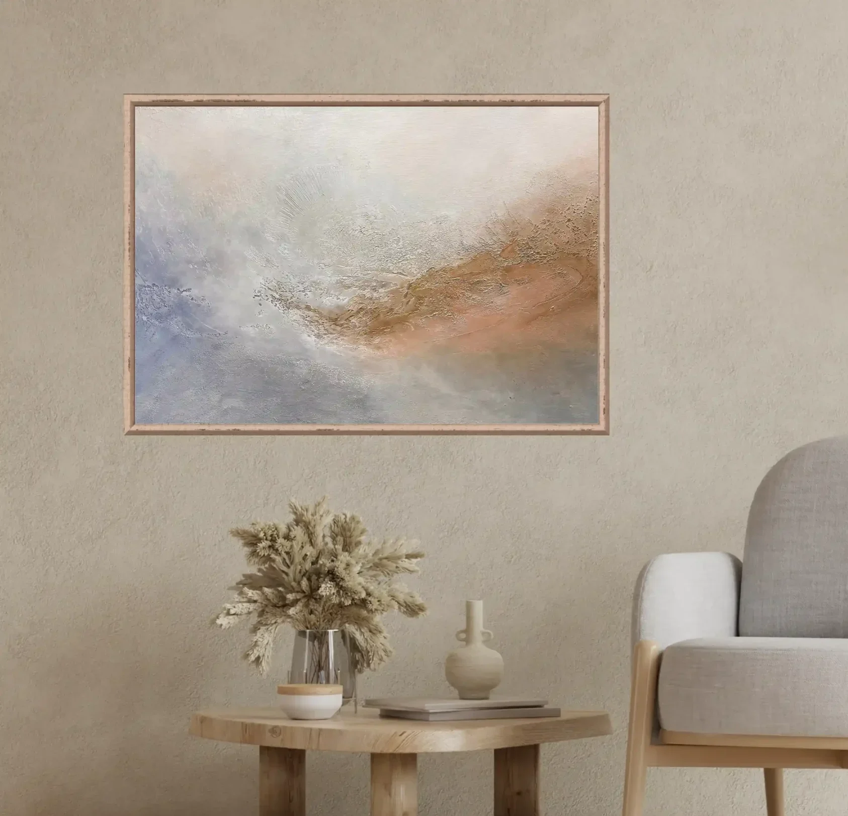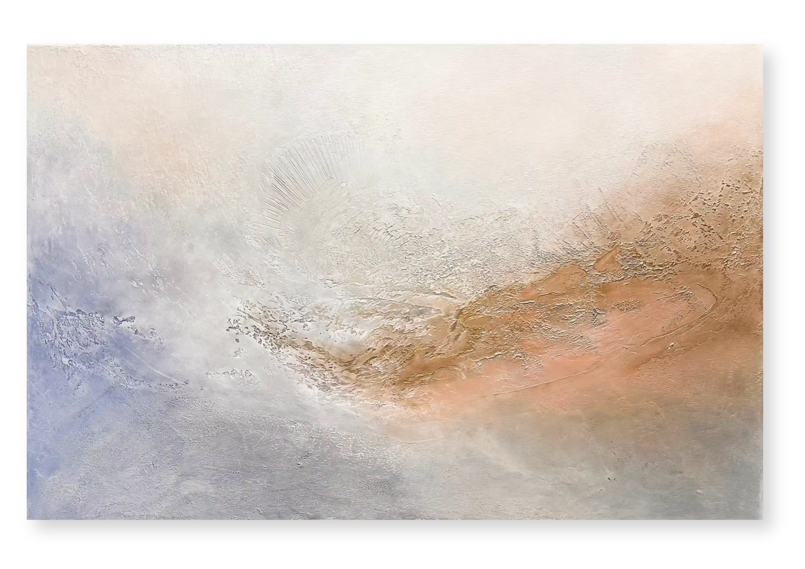 to abstrakcyjny obraz strukturalny oparty na subtelnej grze jasnych i ciepłych i zimnych tonów oraz miękkiej, organicznej faktury. Kompozycja rozwija się horyzontalnie, prowadząc wzrok przez delikatne przejścia kolorystyczne pomiędzy chłodniejszymi partiami a strefami nasyconymi światłem i ciepłem. Obraz nie opisuje pejzażu wprost — przywołuje raczej wrażenie bliskości, rozświetlenia i łagodnego przejścia.